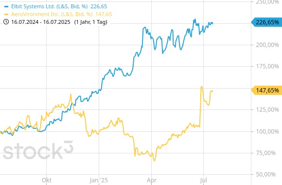 Auf dem internationalen Markt werden die Drohnensysteme des israelischen Herstellers Elbit (WKN: 904218) besonders beachtet. Inländische Verkäufe tragen nur noch zu 29% zum Umsatz des Rüstungsunternehmens bei. Die Auftragsbücher sind prall gefüllt, Kunden stehen Schlange. Beim US-Unternehmen AeroVironment (WKN: A0MJX7) hat das Kleindrohnengeschäft mittlerweile einen Umsatzanteil von 60%. Der Gewinn steigt stetig, nicht zuletzt, weil zahlungskräftige NATO-Staaten, die ihre Verteidigungsausgaben hektisch hochfahren, zu den regelmäßigen Käufern gehören.