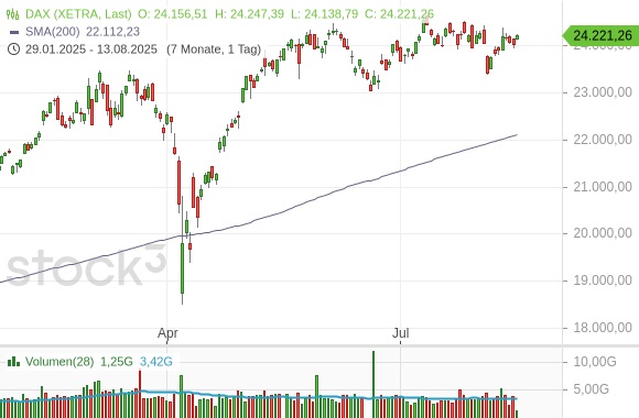 Nachdem wir in den USA und Japan von neuen Allzeithochs berichten konnten, liegt der Gedanke nahe, dass auch der DAX diesem Pfad folgen wird. Doch noch ist es nicht so weit. Obwohl der letzte Donnerstag sehr konstruktiv war (kräftiger Kursanstieg bei sehr robusten Umsätzen), verläuft der deutsche Leitindex noch immer unter dem markanten Allzeithoch (Verlauf) vom 10.7. Das Thema Top-Bildung bei europäischen Aktien (vgl. SIW vom 6.8.25) ist ebenfalls noch nicht vom Tisch.
