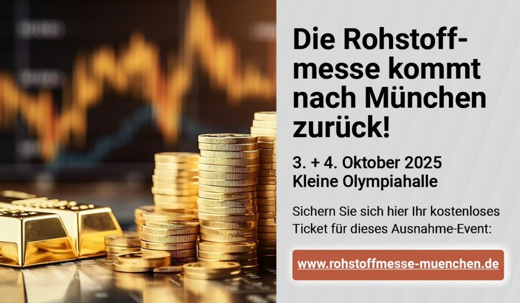 Noch haben wir etwas Zeit, aber der Messeherbst wirft bereits seine Schatten voraus. Aufmerksamen Lesern des Smart Investor-Magazins ist aufgefallen, dass der aktuellen Ausgabe 8/2025 ein Einleger der Rohstoffmesse München beigelegt war. Am 3./4. Oktober ist es so weit, dann treffen sich die Edelmetallfans in der Kleinen Olympiahalle in München. Keynote-Speaker werden sein: „Mr. Dax“ Dirk Müller, der Chef von Swiss Resource Capital, Jochen Staiger, Midas Touch-Herausgeber, Florian Grummes und Rohstoffexperte Prof. Dr. Torsten Dennin. Als Aussteller werden 100 Rohstoffunternehmen erwartet, welche die Anleger vor Ort aus erster Hand über den Gang ihrer Geschäfte informieren werden. Zudem werden auch mehrere Händler vor Ort sein, die Ihnen sicher ein gutes Angebot für physische Ware machen werden. Dazu gibt es natürlich reichlich Gelegenheit zum Networking mit Gleichgesinnten. Das Beste daran: Der Eintritt zur Veranstaltung ist kostenlos. Konkrete Informationen über Aussteller und die Bestellmöglichkeit für die Eintrittskarten finden Sie auf der Webseite des Veranstalters.