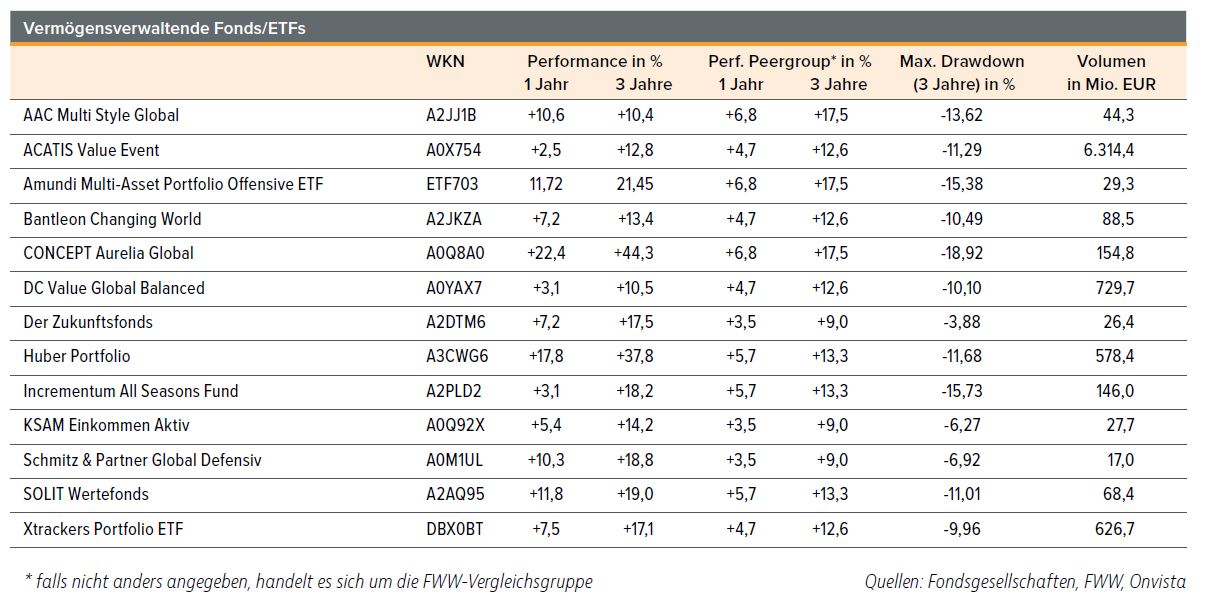 Dirk Stöwer und Martin Beckmann von Kontor Stöwer Asset Management steuern den KSAM Einkommen Aktiv (WKN: A0Q92X; mit +14,2% in drei Jahren mehr als die Vergleichsgruppe). Trotz seines Anleihenfokus konnte der Fonds bislang auch schwierige Phasen für diese Anlageklasse sehr gut bewältigen. Dazu haben der aktive Ansatz und der flexible Einsatz von Futures zur Portfoliosteuerung wesentlich beigetragen. Die Aktienquote liegt in der Regel in der Bandbreite zwischen 25% und 30%. Hier stehen Value Builder im Fokus, also Unternehmen, die niedrig verschuldet sind, hohe Kapitalrenditen generieren und ein Geschäftsmodell aufweisen, das durch einen wirtschaftlichen Burggraben geschützt ist. Zu den Top-Holdings zählt auch Xetra Gold.