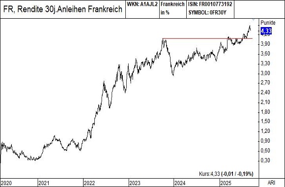 Auch wenn die Politik unablässig über Nachhaltigkeit schwatzt, sieht es in deren ureigenstem Feld, der Fiskalpolitik, alles andere als nachhaltig aus. Die Rendite der 30jährigen französischen Anleihen spricht eine eindeutige Sprache. Sie erreichte in der Vorwoche mit 4,5% ein neues markantes Mehr-Jahres-Hoch. Eine Senkung des Moody’s Rating trieb die Renditen der 10-jährigen Bonds über die von Griechenland und Spanien. Der Spread zu deutschen Bonds stieg auf 80 Basispunkte. Sollte der OAT-BUND-Spread über die magische Marke von 100 Basispunkten anziehen, könnte ernsthaft Panik in den Euro kommen. Das Zutrauen der Märkte nimmt jedenfalls ab und dieser Prozess könnte sich sogar beschleunigen, mit potenziell höchst bedrohlichen Folgen für die Eurozone und letztlich die EU. Schließlich ist die Dimension der französischen Malaise in absoluten Zahlen um ein Vielfaches größer als seinerzeit in Griechenland. Ein Fragezeichen ist erlaubt, ob Deutschland in einer Finanzkrise 2.0 erneut als Retter Gewehr bei Fuß stehen kann. Zwar hat es sich den zweifelhaften Ruf erworben, unter den Blinden der Einäugige in Sachen Staatsverschuldung zu sein, doch ausgerechnet Friedrich „Schuldenbremse“ Merz schickte sich an, diesen Nachhall von Solidität vollends zu verspielen.