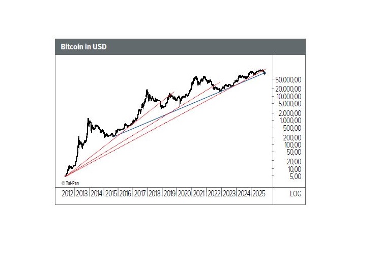 Die Bitcoin-Baisse hat inzwischen ihre Spuren im langfristigen Chartbild (Abb.) hinterlassen. Der Aufwärtstrend seit 2012 hat sich erneut nach unten aufgefächert (Abb., gestrichelte rote Linien). Bestenfalls entsteht aus dem Durchbruch zeitnah eine weitere Fächerlinie. Umkämpft ist aktuell zudem der 2015er Trend (Abb., blaue Linie). Sollte dieser nachhaltig fallen, wäre die Bitcoin-Party aber wohl erst einmal vorbei.