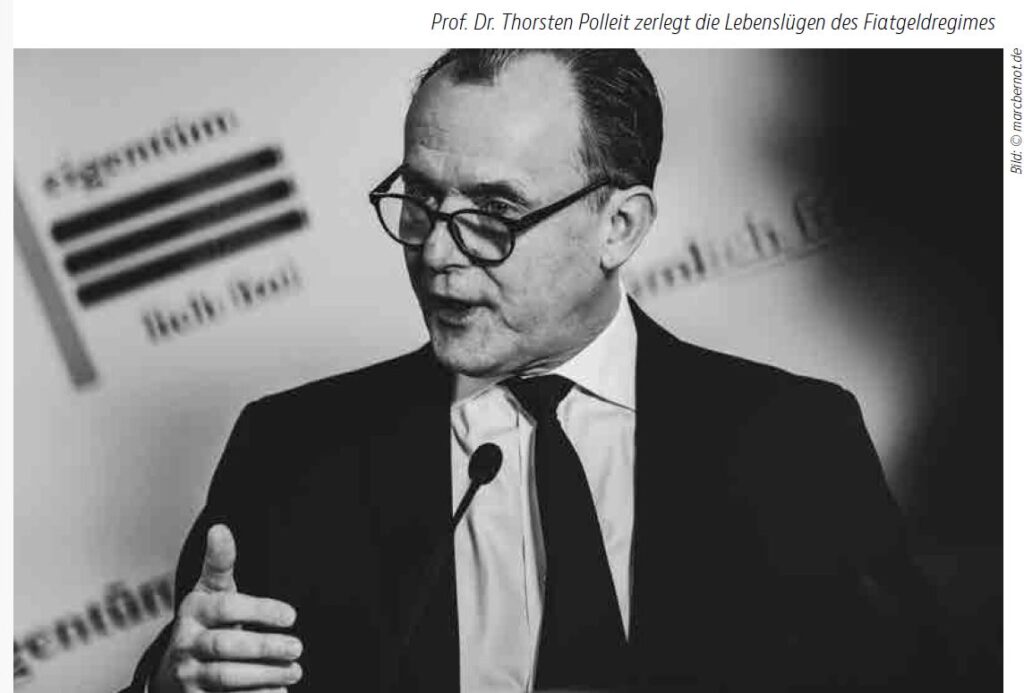 Prof. Dr. Thorsten Polleit, Präsident des Ludwig von Mises Instituts Deutschland, entlarvte in seinem Vortrag medial-geistige Irrtümer, Trugbilder und sonstige Unwahrheiten zur Aufrechterhaltung des Fiatgeldregimes. Herrschaft lasse sich nicht widerspruchsfrei begründen. Stattdessen werde die Bevölkerung getäuscht und zum Komplizen gemacht, indem sie Anteile der „Beute“ erhalte. Der freie Tausch werde ignoriert, obwohl er Nutzen für alle stifte. Die wahren Kosten staatlicher Ausgaben blieben verborgen. Zentralbanken sind keine „Währungshüter“, sondern mindern die Kaufkraft. Eine Geldentwertung von ca. 2% p.a. ist eine als „Preisstabilität“ bezeichnete verdeckte Steuer. Politiker „sparen“ nicht durch eine geringere Neuverschuldung, sondern sabotieren den Wohlstand. Auch seien nicht „wir alle“ der Staat; der teile sich vielmehr in Nettosteuerzahler und -empfänger. Es existiere zudem kein echter Kapitalismus, sondern Interventionismus. In der Ökonomie werde Erfahrungswissen überbewertet, während Verstandeswissen (a priori) unterschätzt werde. Hegel idealisierte den Staat als „höchste Vernunft“, Polleit sieht ihn als Räuberbande. Demagogen experimentierten mit Wirtschaft wie in einem „Meerschweinchenlabor“.