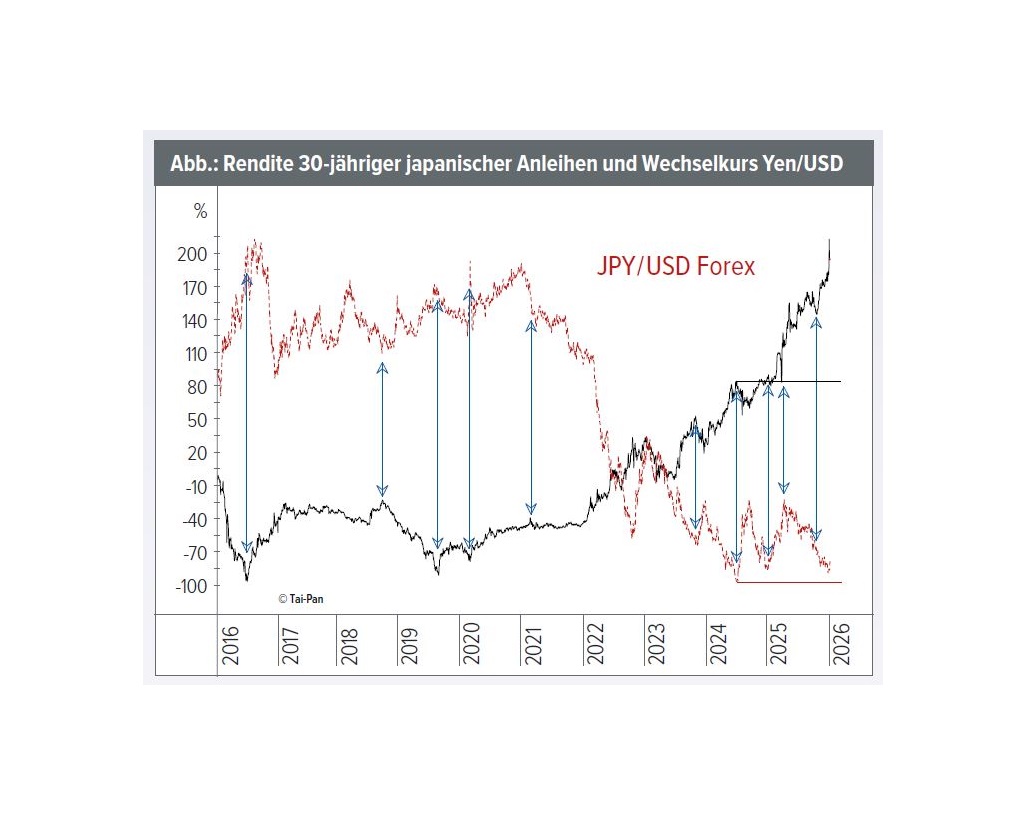 Der japanische Anleihemarkt ist einer der bedeutendsten der Welt. Nach Jahren künstlich gedrückter Renditen stiegen zuletzt besonders die langfristigen Zinsen dramatisch an (Abb., schwarze Linie, linke Skala in Prozent, nicht Prozentpunkten!).