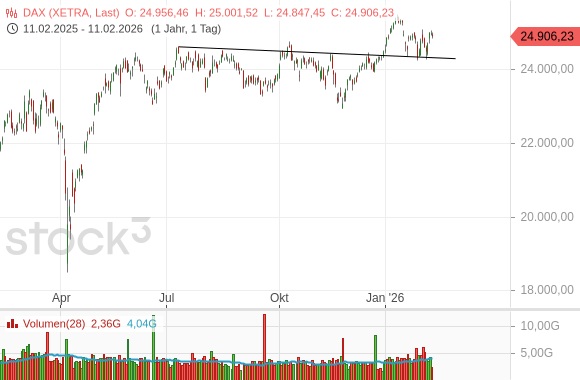Der DAX pendelt weiter in dem zuletzt hier identifizierten Bereich von ca. 24.800 +/- 500 Punkten. Die Neuigkeiten auf Indexebene halten sich hier in Grenzen. Im Wesentlichen bewegen wir uns hier weiter in einer Schiebezone, die nun schon seit Juni 2025 anhält. Wenn so wenig los ist, besteht immer die Versuchung, die Lage etwas überzuinterpretieren. Theoretisch könnte man innerhalb dieser Zone eine Widerstandslinie einzeichnen. Diese war, abgesehen von einem kurzen und gescheiterten Ausbruchsversuch Anfang Oktober 2025, mit mindestens fünf Auflagepunkten/-Bereichen gut bestätigt. Als dann zum Jahreswechsel der Ausbruch nach oben erfolgte, wurde aus dem Widerstand Unterstützung. Insofern hat sich der deutsche Leitindex also eine kleine Stufe hochgearbeitet, was positiv ist, und er hat dies gegen den Sog des Indexschwergewichts SAP geschafft (vgl. Ausgabe der Vorwoche), was ebenfalls ein Pluspunkt ist.