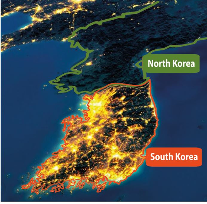Ähnlich lief es in Korea, getrennt seit 1953: gleiches Volk, gemeinsame Geschichte bis 1945, am 38. Breitengrad auseinandergerissen. Heute erwirtschaftet Südkorea ein Pro-Kopf-Einkommen von rund 35.000 USD, ist demokratisch und technologisch führend mit Samsung, SK hynix oder Hyundai. Kulturell ist der K-Pop ein Exportschlager. Im Norden dagegen stagniert das Einkommen bei geschätzten 1.800 USD, periodische Hungersnöte halten die Bevölkerung in Armut gefangen. Beim Wohlstand trennt die beiden Länder der Faktor 20. Besonders schonungslos zeigen Satellitenbilder bei Nacht den Unterschied: Der Süden leuchtet, der Norden liegt im Dunkeln; tagsüber ist es dort immerhin grau. Erschreckenderweise sind Nordkoreaner durchschnittlich bis zu acht Zentimeter kleiner als ihre südlichen Landsleute, die Folge fortwährender Mangelernährung über Generationen. Allein in den 1990er Jahren verhungerten geschätzte zwei bis drei Millionen Menschen – in Friedenszeiten. Energie gibt es nur stundenweise. Kontrolle und Wirtschaftslenkung sind total, das Ergebnis ein Desaster.