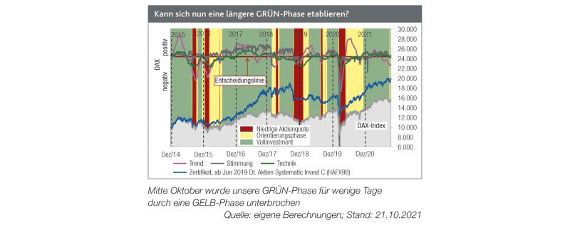 Eine fünftägige GELB-Phase hatte Mitte Oktober zu einer reduzierten Aktienquote in unserem flexiblen Deutschlandfonds, Deutsche Aktien Systematic Invest, geführt.