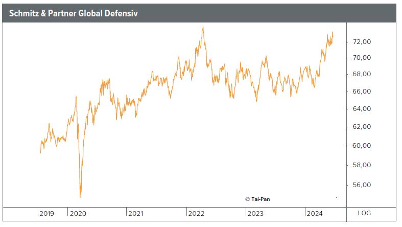 Knapp 60% des gesamten Aktienanteils im Fonds bilden Schweizer Titel wie Novartis oder Bell. Insgesamt verteilt sich das Fondsvermögen zu 43,9% auf Aktien, zu 13,5% auf Renten und Rentenfonds sowie zu 24,6% auf Gold und Silber. Die Cashquote liegt aktuell bei 18,0%. Die Liquidität kann genutzt werden, wenn Kursrückgänge attraktive Chancen bieten. Der Aktienanteil soll im Maximum bei 50% liegen. Die signifikante Allokation von Silber und Gold hat sich, gerade auch mit Blick auf die Edelmetallkursgewinne in den vergangenen Monaten, als sprichwörtlich goldrichtig erwiesen. In der Fondsstatistik von „DAS INVESTMENT“ zählt der SPGD in der Kategorie „Mischfonds Defensiv Welt“ in unterschiedlichen Zeiträumen (Stand: 19.6.2024) zu den Topfonds. Auf Sicht der letzten drei Jahre liegt der Fonds auf Rang 29 von 369. Noch eindrucksvoller ist die Performance über fünf Jahre: In diesem Zeitraum lässt der Fonds rund 96% seiner Peergroup hinter sich (Rang 12 von 341 beobachteten Fonds). Auf beiden Zeitebenen liegt die Volatilität des Fonds bei einem ausgezeichneten Wert von weniger als 8%.