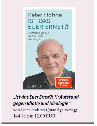 Peter Hahne, Jahrgang 1952, war über viele Jahre bis 2017 beim ZDF und moderierte dort Sendungen wie „heute“ oder „Berlin direkt“. Seit 2017 ist der bekennende Christ und Hobbysegler als gefragter Redner unterwegs und betätigt sich als Autor von inzwischen über 40 Büchern mit einer Auflage von mehr als sechs Millionen. Dabei bürstet er dem Mainstream gerne gegen den Strich, sei es bei Corona, der Migration, dem Klima oder dem Ukrainekonflikt. So lauten z.B. seine letzten Titel „Ist das Euer Ernst?!“, „Das Maß ist voll“ oder „Nicht auf unsere Kosten!“. Hahne lebt zwar in der Hauptstadt, ist aber im „politischen Berlin“ aufgrund seiner Art, die Missstände in diesem Lande beim Namen zu nennen, so etwas wie eine „Persona non grata“.